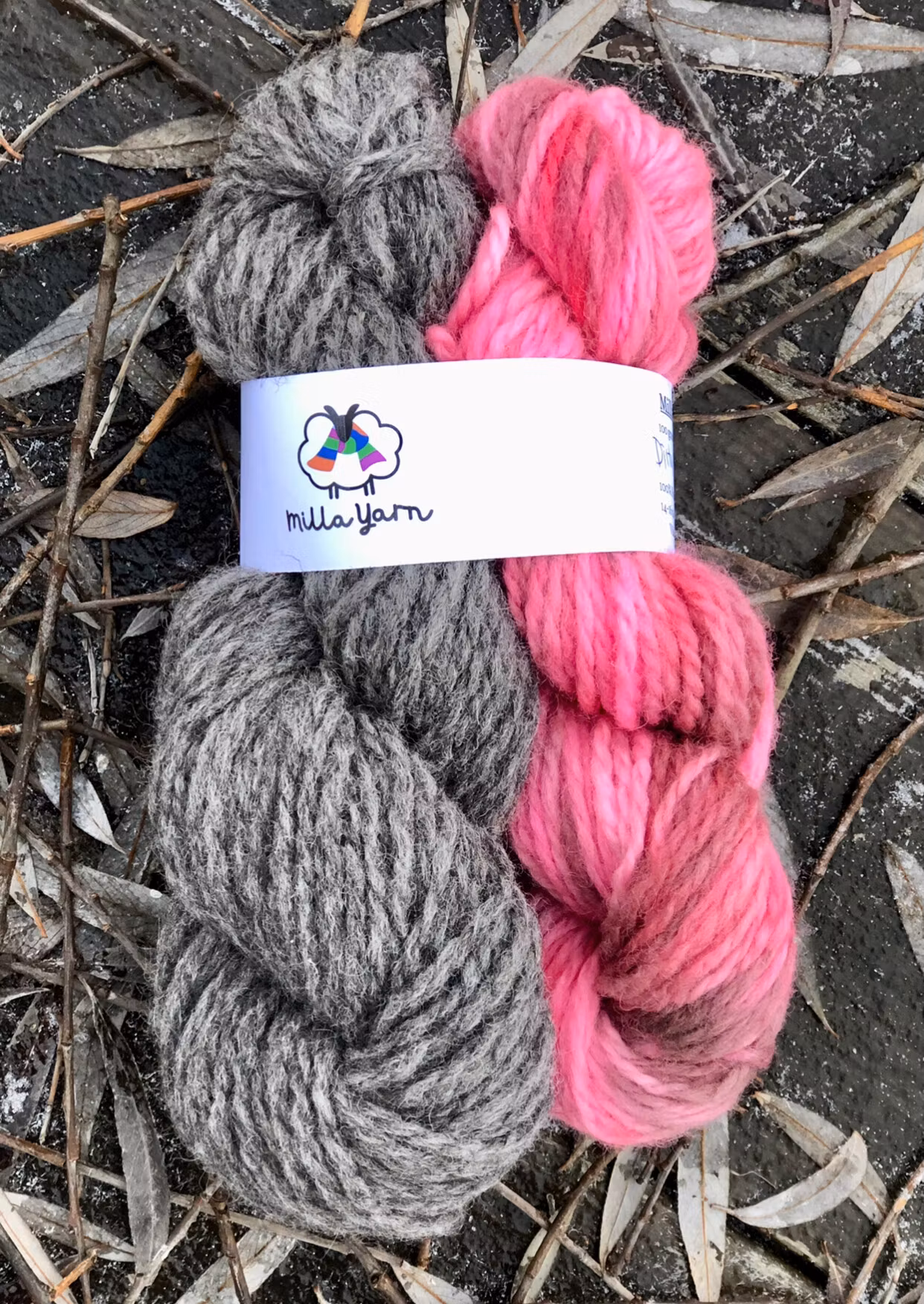 Set med naturfägad samt handfärgad Milla Vams - ett mjukt och lätt 2-trådigt kardgarn (Chunky 166 m/100 g) av 100% norsk obehandlad ull från Rauma Ullvarefabrik
