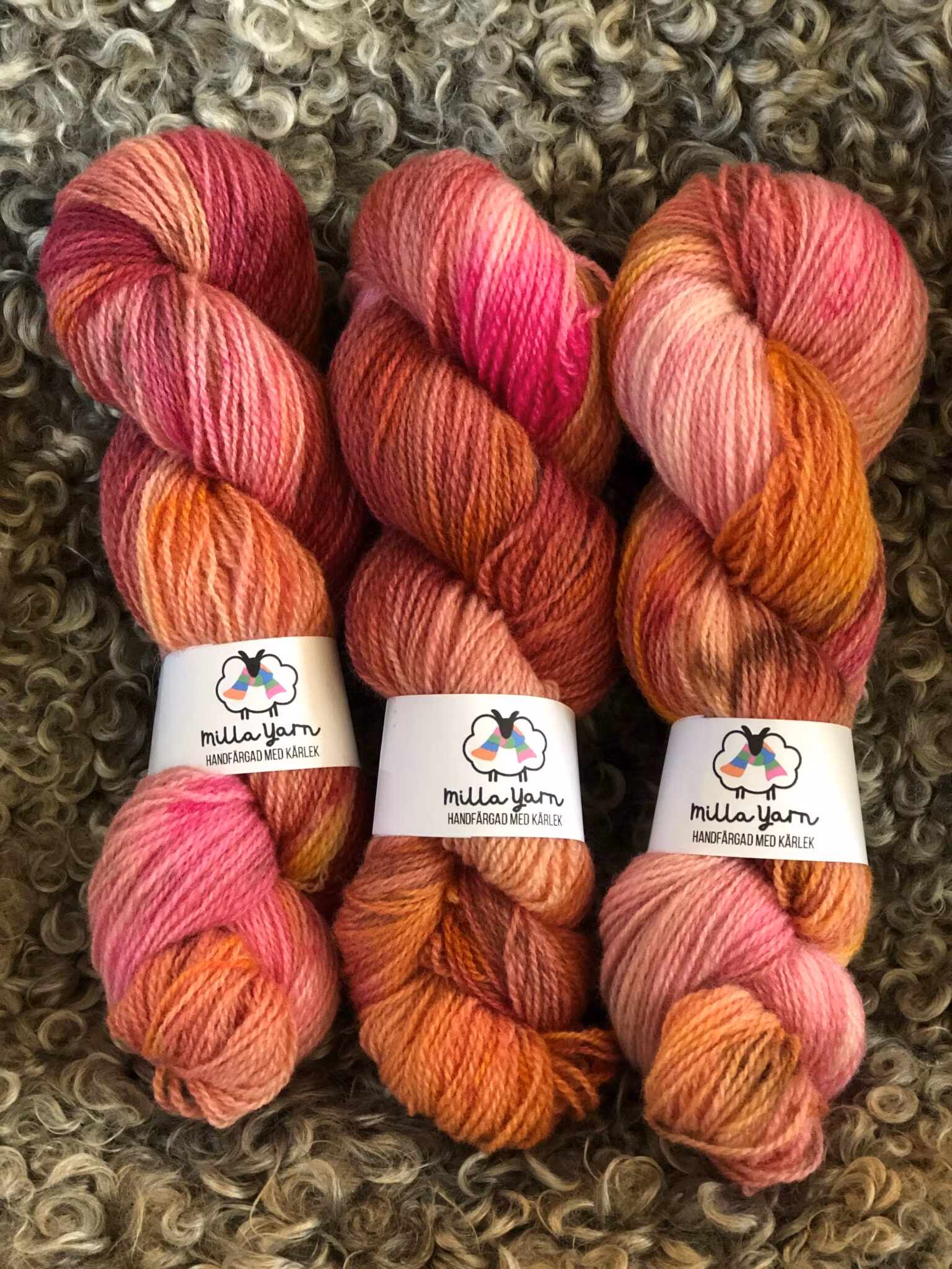 Handfärgat tunt 2-trådigt garn (225 m/50 g) i 100 % obehandlad norsk lammull från Rauma Ullvarefabrikk. Mjuk fylligt och underbart. Ersätter utan problem annat fingeringgarn. Passar jättefint till sjalar, mössor, koftor, tröjor, vantar mm.