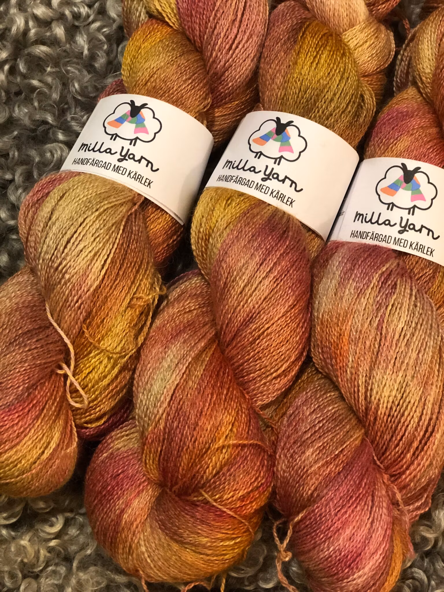 Som med alla handfärgade garner är det rekommenderat att skifta mellan två härvor för att få ett jämnt resultat.