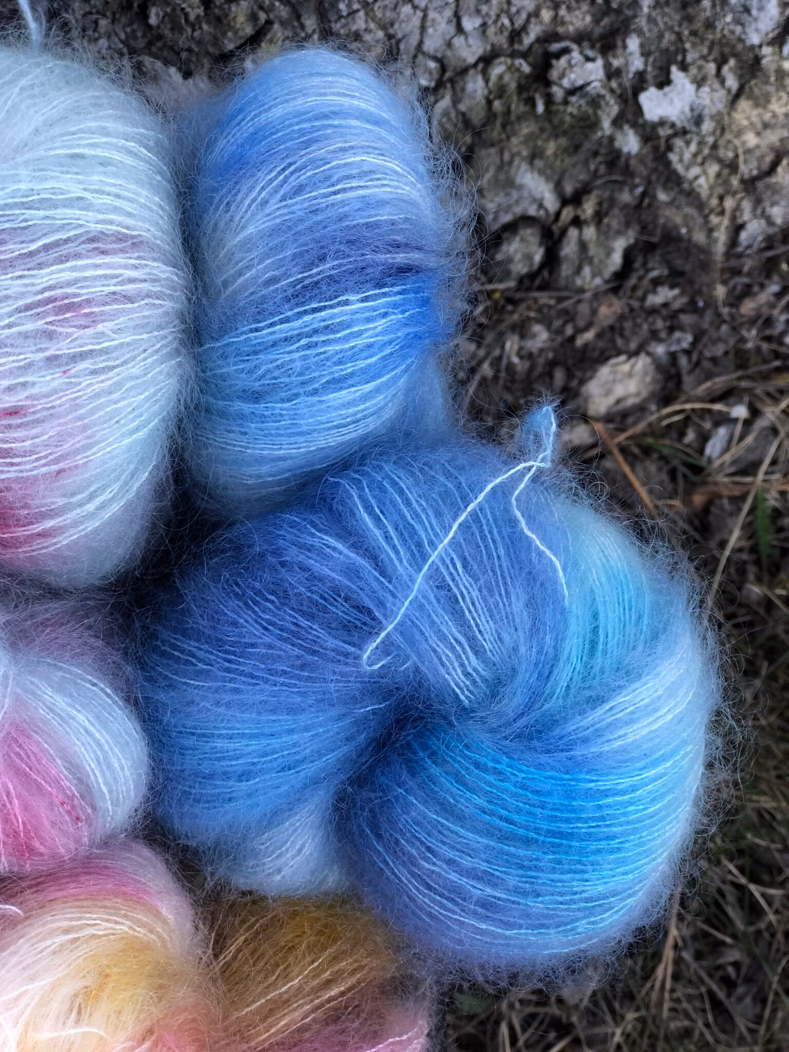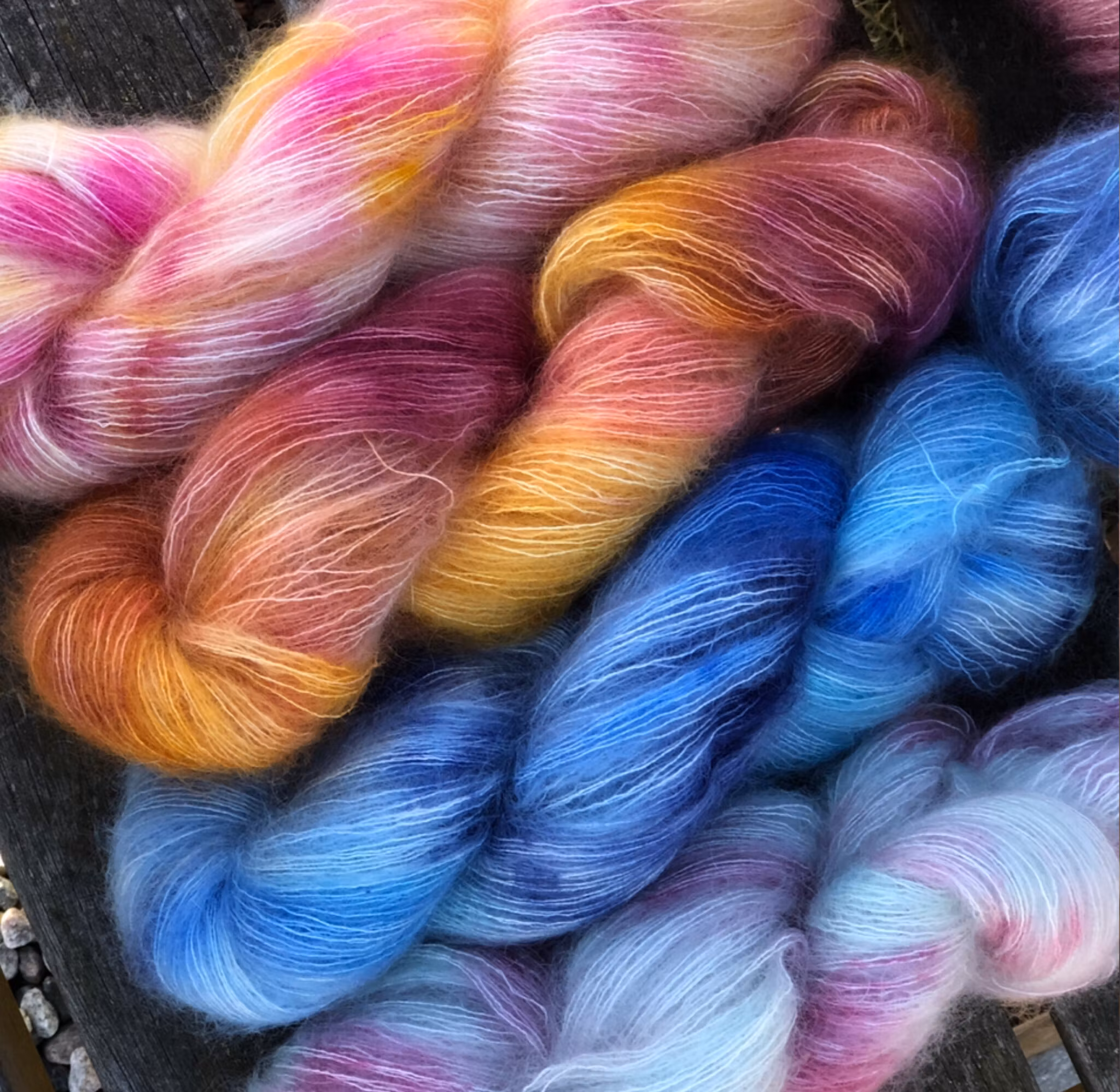 Handfärgad med kärlek av Camilla Wallgren med högkvalitativa GOTSgodkända pigment på spårbar, etiskt framställd, obehandlad 64% mohair och 36% silke. Mohairen kommer från Sydafrika, och vi är riktigt stolta över att erbjuda RMS certifierad mohair. Silken kommer från odlingar i Kina.