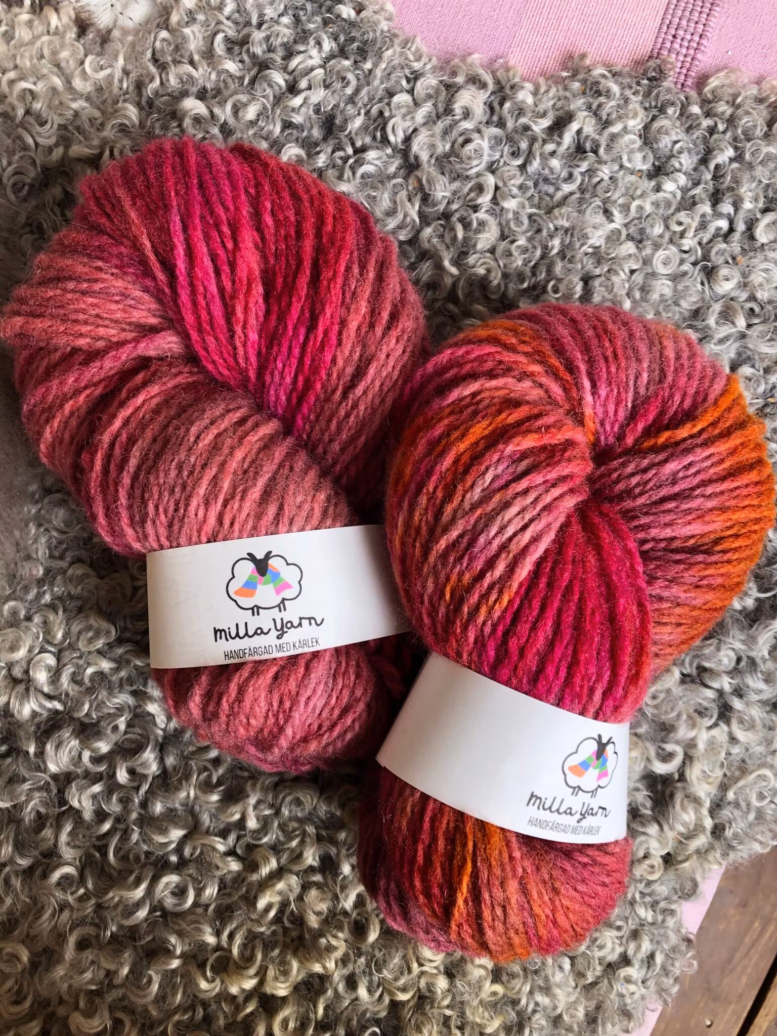 Milla Vams är ett handfärgat mjukt och lätt 2-trådigt kardgarn (Chunky 166 m/100 g) av 100% norsk obehandlad ull från Rauma Ullvarefabrikk. Det värmer ordentlig
