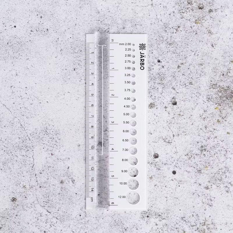 Stickmått från Järbo med hål där du kan mäta grovleken på dina "anonyma" stickor. Stickmåttet är i hållbar hårdplast och med mäthål från 2-12 millimeter. Linjalen är 14,5 cm lång och även amerikanska inches finns att mäta med. Stickmåttet har också ett praktiskt förstoringsglas för mönster med liten text, eller om du vill se vad det står på stickan.